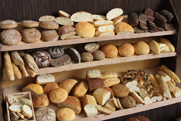 - Ржаной хлеб. Серый круглый хлеб с мукой с меньшими порами, хлеб с посыпкой, булочки с отрубями, серый багет с ржаной мукой.