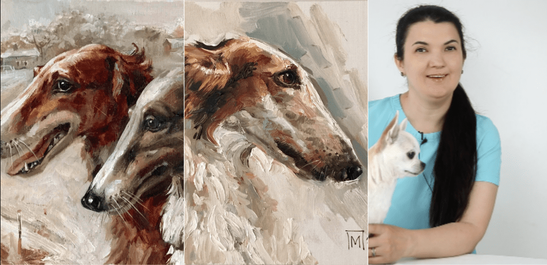 4. Напишем маслом двух борзых в зимнем пейзаже: сделаем подмалевок и заложим объем, уточним пропорции, поработаем над шерстью животных, нарисуем пейзаж.