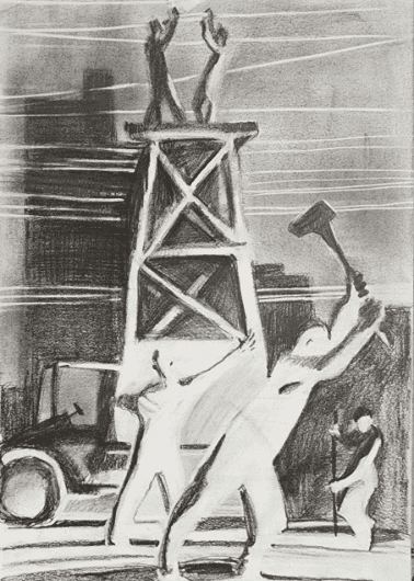 В основное время мастер-класса рисуем чернографитными карандашами копию работы Дейнеки: сначала закрасим бумагу мягким чернографитным карандашом, а затем будем рисовать резинкой (вынимать белое) и карандашом добавлять тёмное. Посмотрим, как и за счёт чего организуется лист и создается пространство.