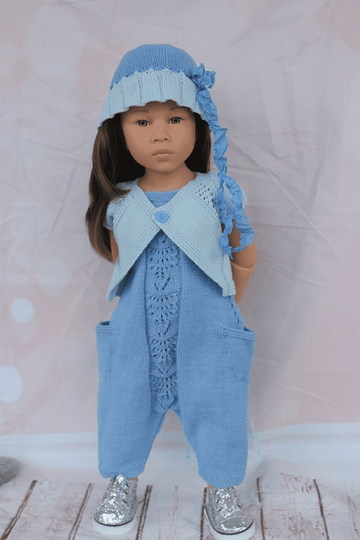Комплект на кукол Готц 42-50 см, состоит из интересного комбинезона на лямочках, с кармашками и японским узором на детали переда, болеро затейливого фасона и исполнения и панамки.