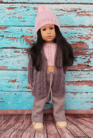 В него входят модные брючки с ажурными полосами по бокам, короткий топик с ажурной полоской на детали переда, удлиненный кардиган с V-образным вырезом, с отделкой ажурными полосками и рукавами в резинку 2х2, шапочка-тыковка резинкой 2х2.