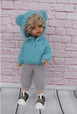 Комплект состоит из кофточки с капюшоном узором Шахматка, с застежной на планке и ушками на капюшоне, комбезика на лямочках и короткого топа, который можно одевать как поверх комбинезона, так и под.