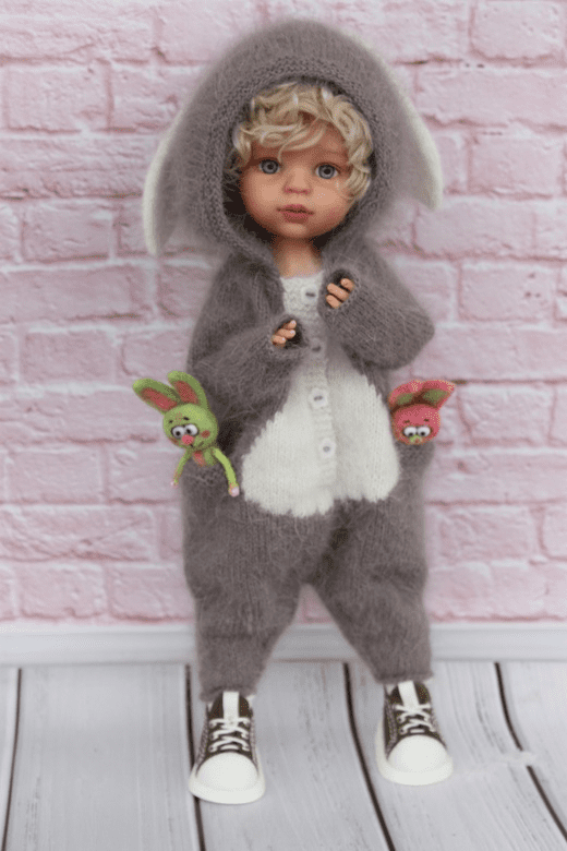 Вы свяжете чудесный, модный комбинезон-кигуруми-с большим капюшоном, кармашками, с застежкой спереди на пуговках и ушками зайки на капюшоне.