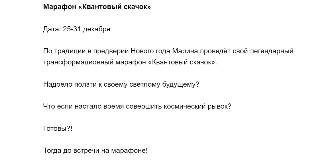 По традиции в предверии Нового года Марина проведёт свой легендарный трансформационный марафон «Квантовый скачок».