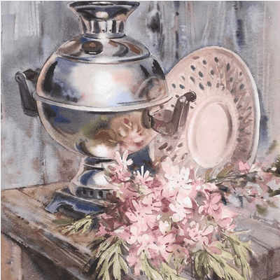 Собираем все знания вместе и закрепляем в натюрморте с дачными мотивами. Плюс передаем блестящую фактуру самовара и древесный узор на столе. Ищем гармонию в цветовом решении и комбинируем акварельные техники.