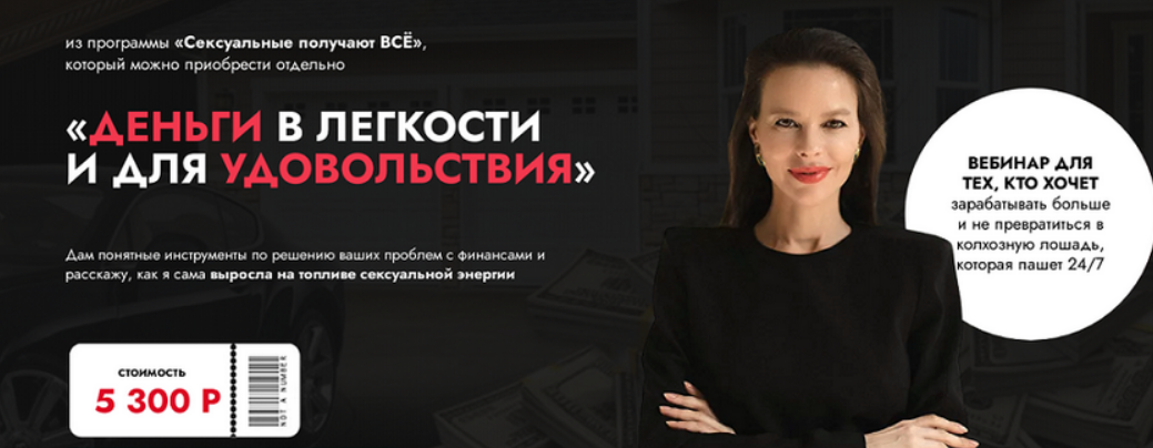 Дам понятные инструменты по решению ваших проблем с финансами и расскажу, как я сама выросла на топливе сексуальной энергии