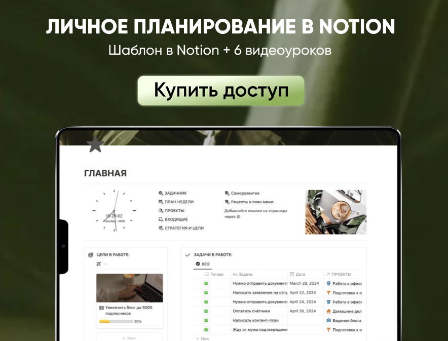 Внутри вы найдете шаблон полноценной системы планирования в Notion, созданный с учетом методик тайм-менеджмента, и 6 видеоуроков, которые помогут разобраться в программе, внедрить базовое планирование и организовать все ваши дела