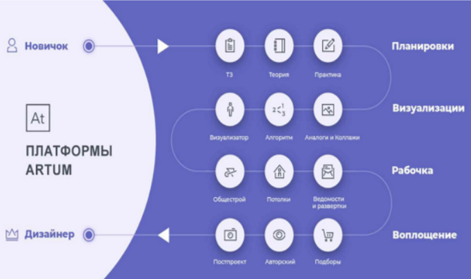 Программа обучения продиктована жизнью. Работа дизайнера интерьера делится на 4 части: планировки, 3D-визуализации, рабочая документация и воплощение.