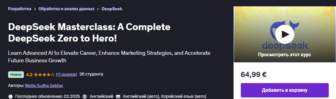 Откройте для себя мощь DeepSeek, передовой платформы ИИ, которая производит революцию в принятии решений , автоматизирует процессы и предоставляет действенные идеи. Этот всеобъемлющий мастер-класс призван провести вас от полного новичка до эксперта DeepSeek, вооружив вас навыками использования ИИ для повышения производительности, анализа данных и бизнес-аналитики . Независимо от того, являетесь ли вы бизнес-профессионалом, разработчиком программного обеспечения или энтузиастом ИИ, этот курс DeepSeek Masterclass: A Complete DeepSeek Zero to Hero! предоставит вам знания и практический опыт для максимального раскрытия потенциала DeepSeek.