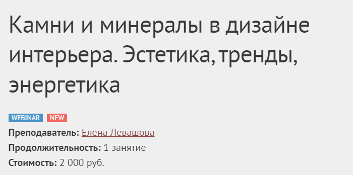 Наиболее известна своей страстью к натуральным камням в интерьере икона современного дизайна Келли Уистлер. В качестве примеров рассмотрим ряд ее работ, а также проекты ее именитых коллег, представляющих разные дизайнерские школы и стили. Разберем разные задачи использования камней и минералов в интерьерах и разной сложности приемы оформления интерьера. Обсудим разницу фактуры и текстуры, исследуем, как применять эти выразительные материалы в создании общей композиции интерьера.