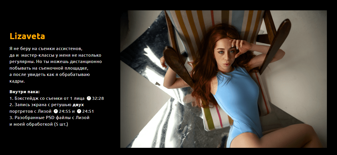 Я не беру на съемки ассистенов, да и мастер-классы у меня не настолько регулярны. Но ты можешь дистанционно побывать на съемочной площадке, а после увидеть как я обрабатываю кадры.