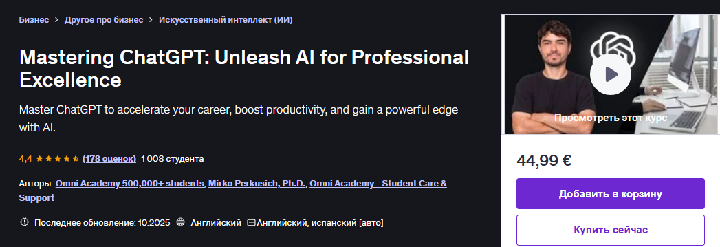Вы готовы прокачать свою карьеру с помощью передовых навыков в области ИИ? Этот комплексный курс Mastering ChatGPT: Unleash AI for Professional Excellence предоставляет таким профессионалам, как вы, мощные практические методы для повышения производительности, креативности и эффективности.