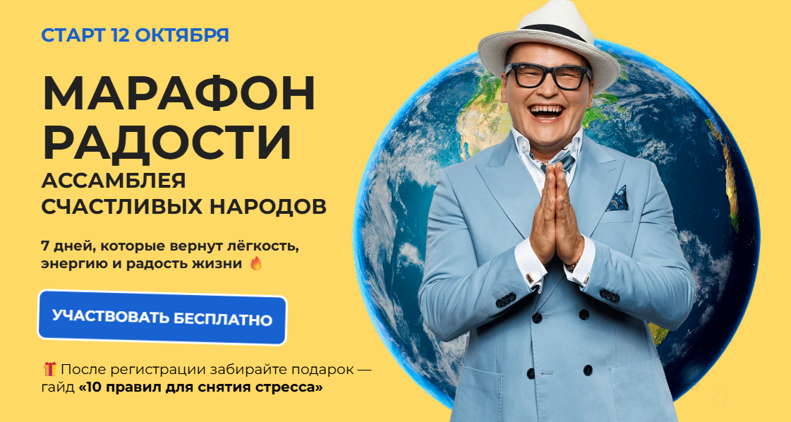 Марафон проводит Митя Ефимов — клинический психолог, Мастер Йоги смеха и двукратный чемпион мира по смеху.