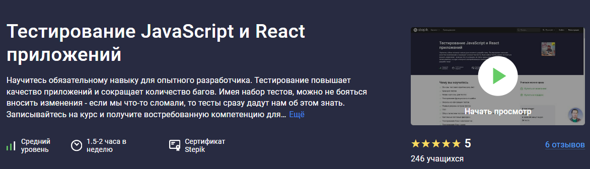 Научитесь обязательному навыку для опытного разработчика. За 7 часов вы освоите Jest и Testing Library, научитесь писать юнит-тесты и настраивать интеграционные тесты. Вы сможете доказывать работоспособность кода, снижать количество багов и безопасно рефакторить. Курс подходит как новичкам, так...stepik.org