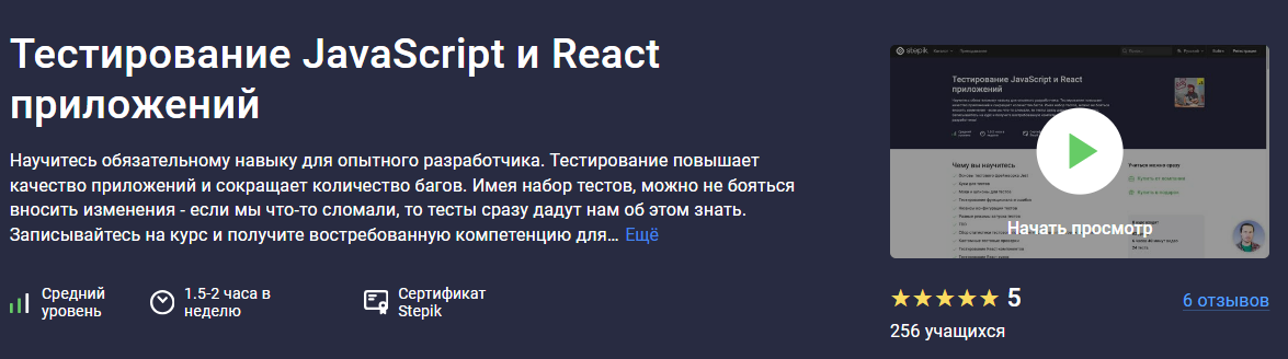 Научитесь обязательному навыку для опытного разработчика. За 7 часов вы освоите Jest и Testing Library, научитесь писать юнит-тесты и настраивать интеграционные тесты. Вы сможете доказывать работоспособность кода, снижать количество багов и безопасно рефакторить. Курс подходит как новичкам, так...stepik.org