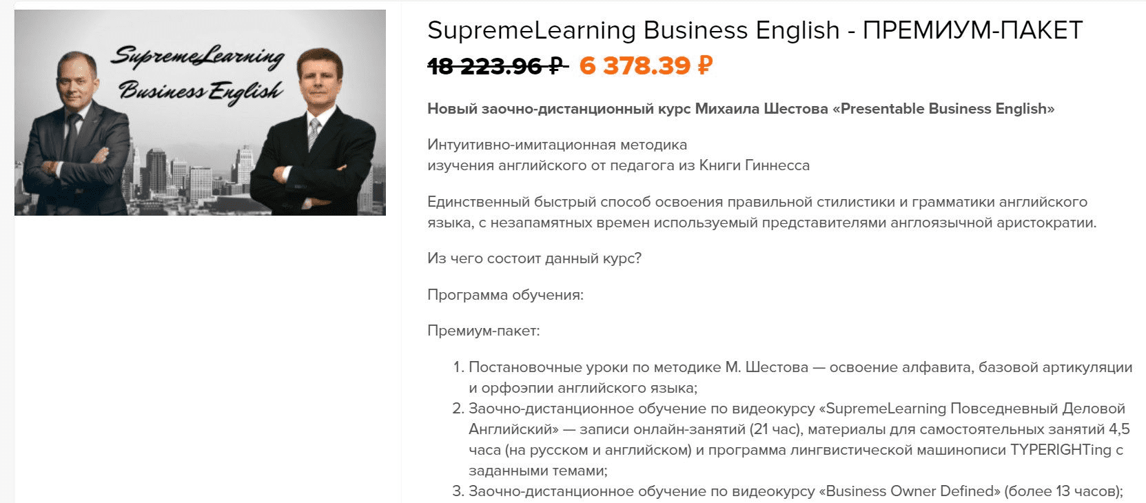 - Заочно-дистанционное обучение по видеокурсу «SupremeLearning Повседневный Деловой Английский» — записи онлайн-занятий (21 час), материалы для самостоятельных занятий 4,5 часа (на русском и английском) и программа лингвистической машинописи TYPERIGHTing с заданными темами;