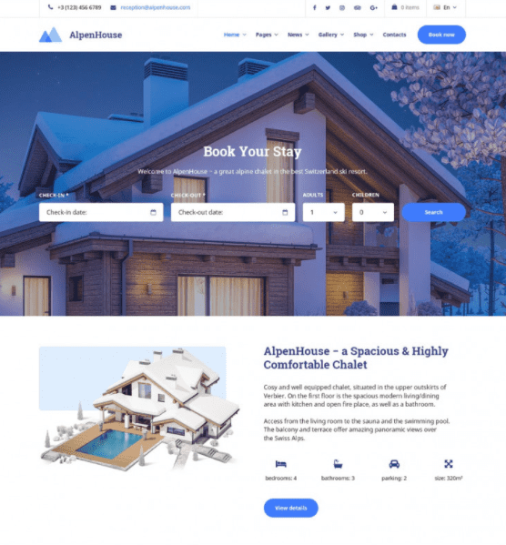AlpenHouse - это тема WordPress для бронирования отелей, идеально подходящая для шале, гостевых домов, гетт, отелей, курортных резиденций и других типов жилья, сдаваемого в аренду. Тема поставляется со специальным конструктором сайтов WordPress для аренды жилья: PMS с гибкими правилами бронирования, синхронизация бронирований с OTA, платежные шлюзы и многое другое. Продуманный и профессиональный дизайн этой темы поможет без труда создать ваш бренд по аренде жилья для отдыха.