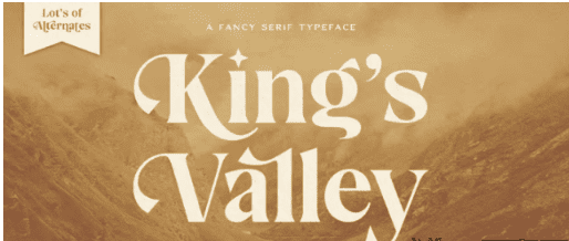 King's Valley - элегантный шрифт с засечками и множеством функций. Он оснащен стандартными лигатурами и альтернативами Swash, Stylistic и Titling для более эффектного дизайна. Доступ к альтернативам осуществляется с панели OpenType в любой программе, поддерживающей OpenType, или ищите их в окне Glyphs / Character.