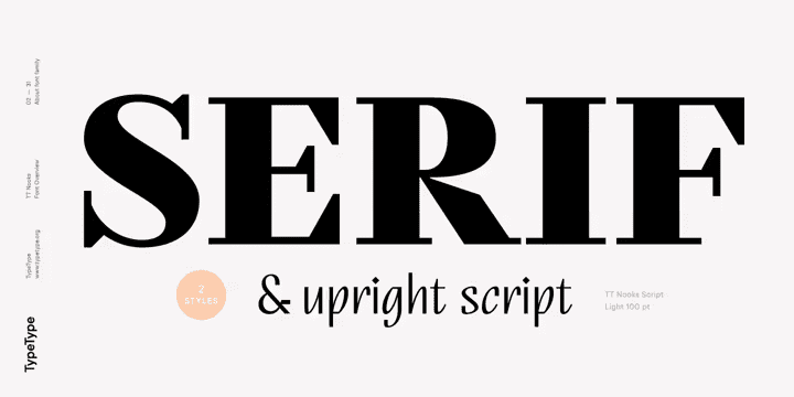 TT Nooks - это экспериментальное семейство шрифтов, которое включает в себя высококонтрастный засечный шрифт TT Nooks и вертикальный курсив TT Nooks Script. Несмотря на разницу в стиле, оба подсемейства хорошо уживаются друг с другом, что отчасти объясняется их схожими пропорциями. Каждое из подсемейств включает 4 начертания: Light, Regular, Bold и Black.