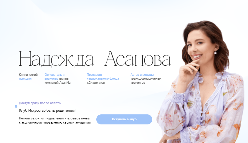 Надежда Асанова — Клинический психолог, резидент национального фонда «Диалогика», основатель и визионер группы компаний AsanNa, мама 4 детей, автор и ведущая трансформационных тренинговnadezhdaasanova.com
