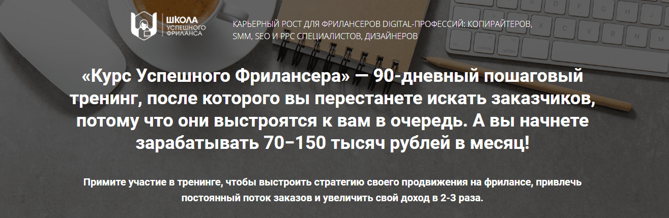 Курс Успешного Фрилансера — единственная программа в рунете, которая направлена на прокачивание тех навыков фрилансера, благодаря которым вы сможете продавать свои услуги и зарабатывать деньги. Вы всегда можете получить очередную специальность, но это не даст вам новых клиентов. А с Курсом Успешного Фрилансера новые клиенты появятся у вас очень быстро.