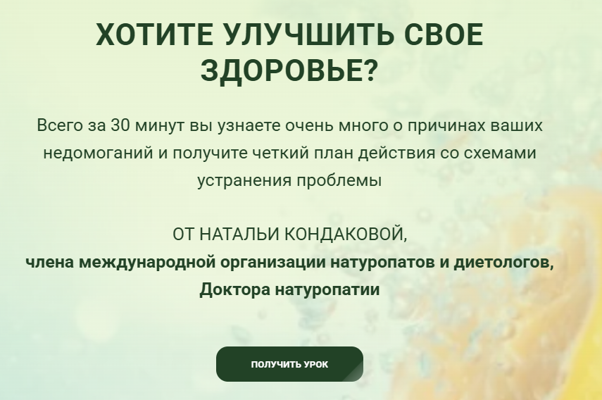 Всего за 30 минут вы узнаете очень много о причинах ваших недомоганий и получите четкий план действия со схемами устранения проблемы от Натальи Кондаковой, члена международной организации натуропатов и диетологов, Доктора натуропатии