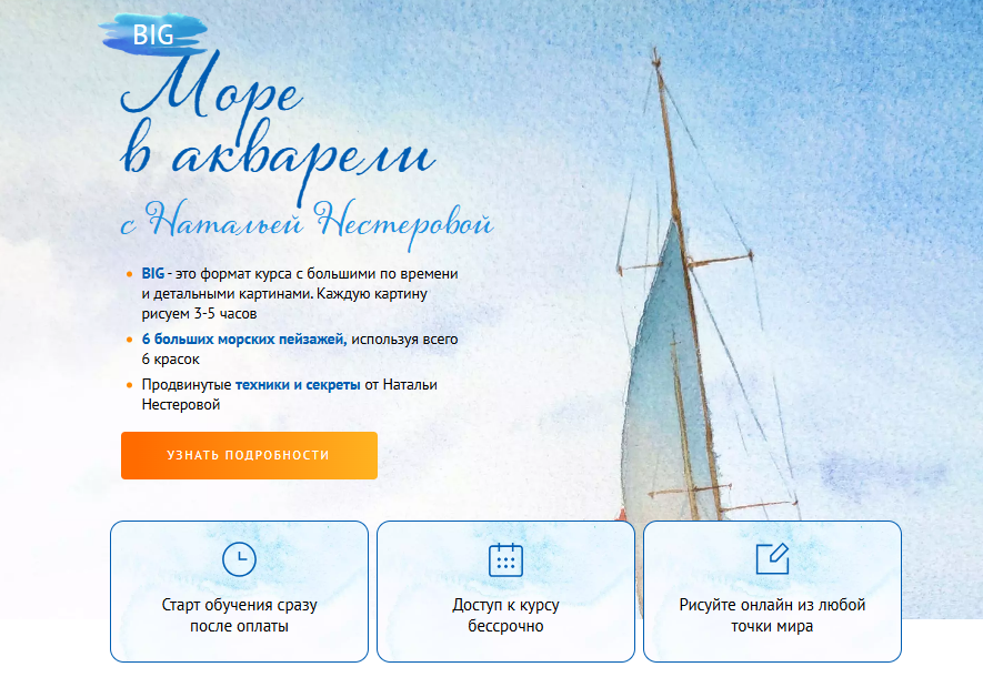 BIG - это формат курса с большими по времени и детальными картинами. Каждую картину рисуем 3-5 часов. 6 больших морских пейзажей, используя всего 6 красок. Продвинутые техники и секреты от Натальи Нестеровойsobakarisovaka.ru