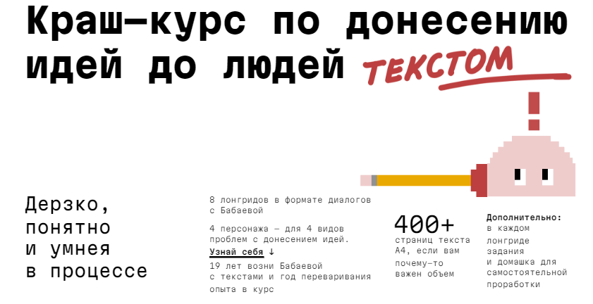 Курс Бабаевой для тех, кто хочет доносить свои идеи — дерзко, понятно и умнея в процессе. Лонгриды в формате диалогов учителя и ученика. Научитесь вычленять из клубка мыслей в голове зажигательные куски и превращать их в тексты без потери яркостиchangerschool.ru