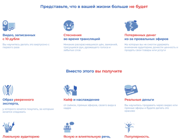 Поймете, как избавиться от страха перед объективом, освоите рабочие техники, которыми снижают волнение перед эфиром профессиональные телеведущие. Узнаете, что на самом деле думают о вас люди, когда смотрят ваше видео.