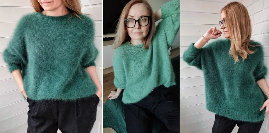 Изумрудный свитер связан из бобинной ангоры Biagoli Modesto Malo 650м/100гр в 2 нити, плотность 19п*22ряда, спицы 4 для основного полотна, 4,5 для кругового, 3 - для резинок.