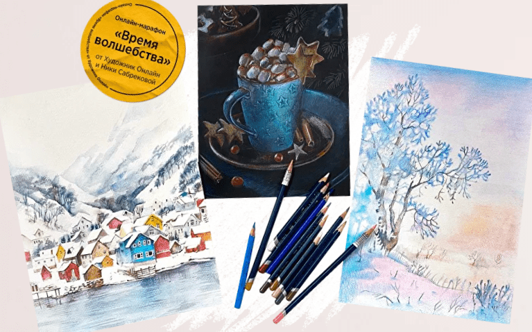 Вебинарный курс: на одном уроке ученики нарисуют заснеженное дерево, на втором — уютную чашку какао с маршмеллоу, а на третьем — сказочный пейзаж с разноцветными домиками на берегу горного озера.www.hudozhnik.online