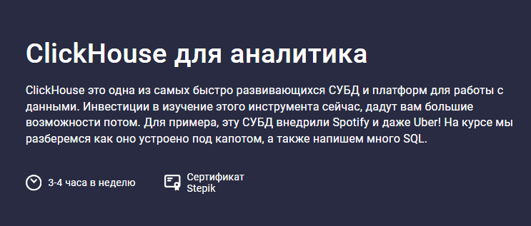 ClickHouse это одна из самых быстро развивающихся СУБД и платформ для работы с данными. Инвестиции в изучение этого инструмента сейчас, дадут вам большие возможности потом. Для примера, эту СУБД внедрили Spotify и даже Uber! На курсе мы разберемся как оно устроено под капотом, а также напишем...stepik.org