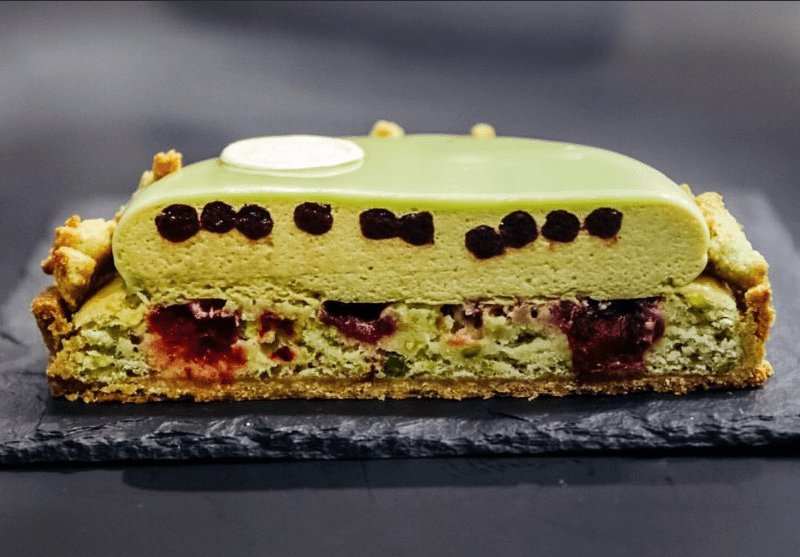 Тема веганская и безглютеновая, которая сейчас активно набирает обороты и интерес среди кондитерских и их гостей. Работать будем на примере полностью отвечающего этой теме «Фисташкового тарта»: фисташковое песочное тесто; фисташковый крамбл; бисквит с вишней; вишневое мармеладе; фисташковый мусс; фисташковая глазурь.
