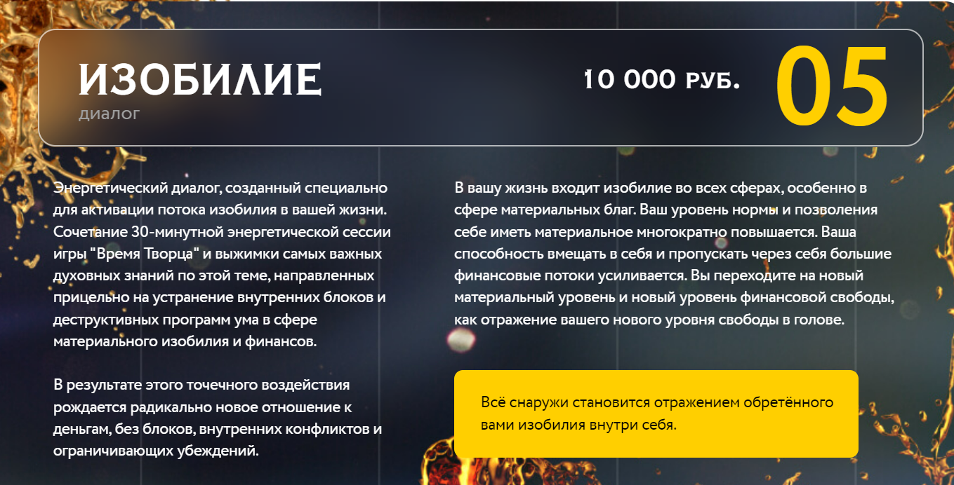 Сочетание 30-минутной энергетической сессии игры "Время Творца" и выжимки самых важных духовных знаний по этой теме, направленных прицельно на устранение внутренних блоков и деструктивных программ ума в сфере материального изобилия и финансов.