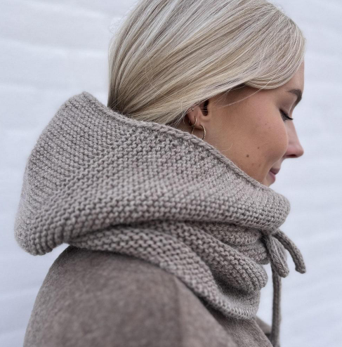 Перед нами сочетание теплого капюшона и мягкого шарфа. Когда капюшон опущен, он выполняет функцию красивого шарфа с бантом из завязок полого шнура.
