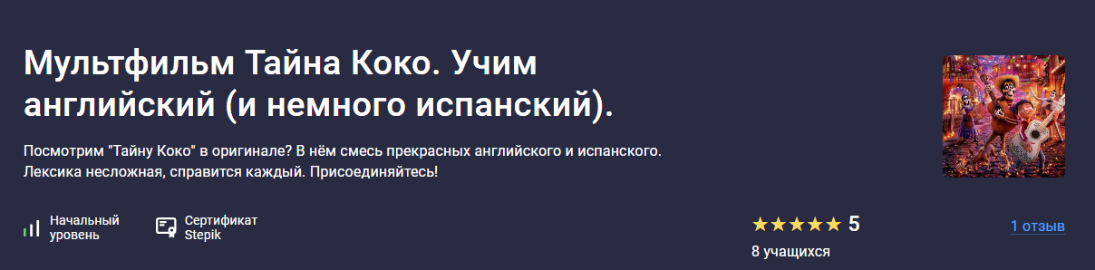 Курс предлагает возможность посмотреть мультфильм "Тайна Коко" в оригинале (на английском и испанском языках), услышать и выучить множество интересных фраз, которые вы сможете применять в речи.