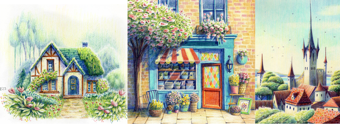 Вас ждёт работа с эскизом, переносом изображения на бумагу, поэтапное рисование здания, проработка заднего плана, зелени и дворика
