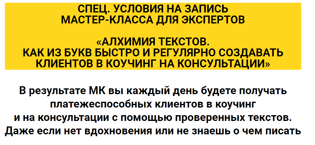 В результате МК вы каждый день будете получать платежеспособных клиентов в коучинг и на консультации с помощью проверенных текстов. Даже если нет вдохновения или не знаешь о чем писать. Если бы мой сын спросил меня, как ему привлечь клиентов в коучинг. Я бы ответил: «Напиши текст». Потому что текст — это просто, быстро и работает.Но как показывает мой опыт общения с экспертами, не у всех все так гладко. Многие, и начинающие и те, кто уже ведет клиентов оффлайн или в инете, сталкиваются с похожими проблемами: