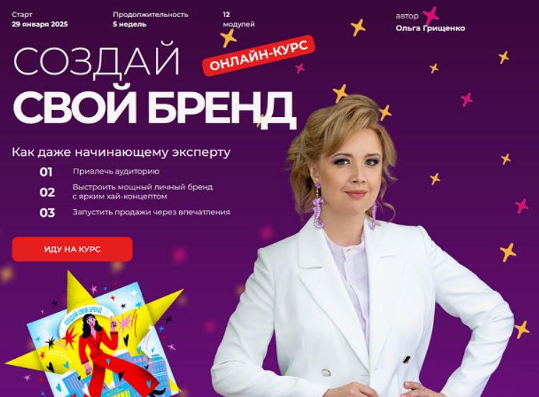 Авторский курс Ольги Грищенко «Создай свой бренд» позволит даже начинающему эксперту выстроить мощный личный бренд с ярким хай-концептом, привлечь аудиторию и запустить продажи через впечатления за короткое время.