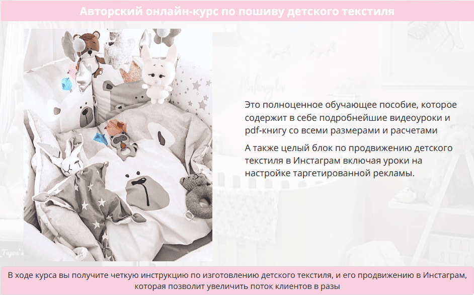 В ходе курса вы получите четкую инструкцию по изготовлению детского текстиля, и его продвижению в Инстаграм, которая позволит увеличить поток клиентов в разы.