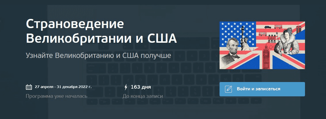 Цель данного курса – ознакомление слушателей с историей Великобритании и Соединенных Штатов Америки, их географией, государственным устройством, историей культуры и искусства, а также историей их взаимоотношений с некоторыми другими странами, включая Россию. Данный курс уделяет внимание различным традициям и обычаям стран, их современной жизни, особенностям социального строения стран на данном этапе их развития, современной культуре Великобритании и США, структуре британского и американского образования и т.д.