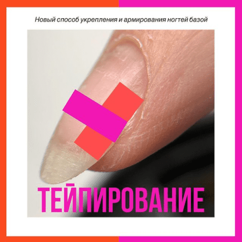 Тейпирование - новый способ укрепления и армирования ногтей базой. Фиксация из базового покрытия решает такие проблемы, как хрупкость квадрата, трещины в стрессовой зоне, трещины и выгибания в перепиленных участках, перепиленные стенки, отслойки с центра.