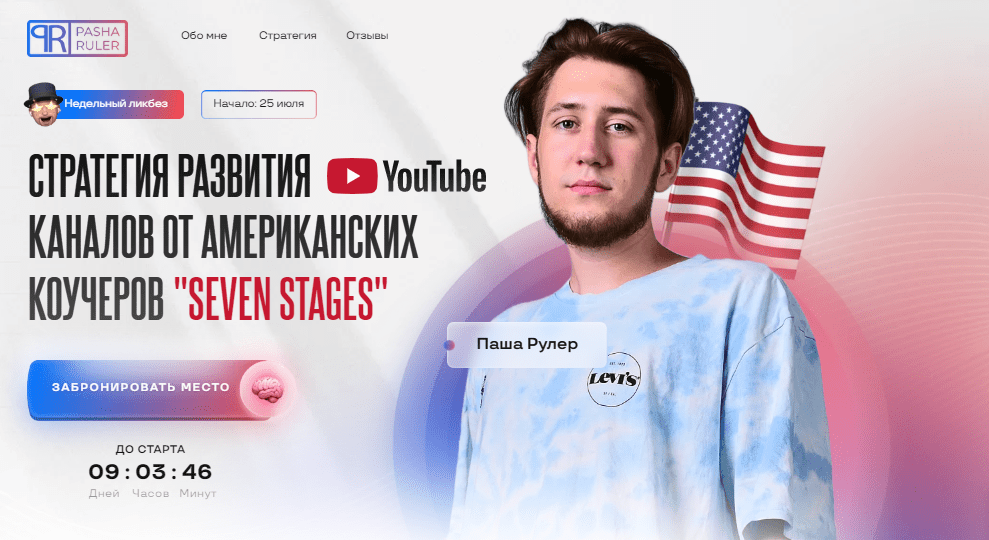 Блогер-эксперт с сетью из 20-ти американских Ютуб каналов Паша Рулер в течение недели поделится стратегией развития от американских коучеров "SEVEN STAGES" и расскажет, как быстро выводить каналы на монетизацию и начать зарабатывать деньги в интернетеrulerpasha.ru