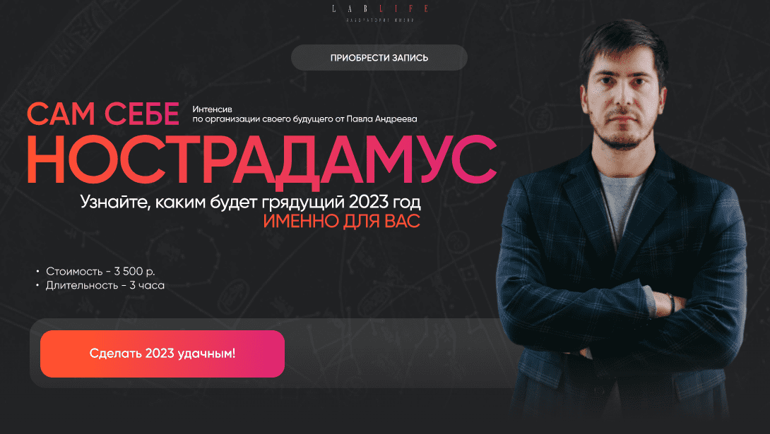 - Участие в игре "Сам себе Нострадамус" для расчета коридора событий своего будущего в 2023-м году: научитесь строить карты; сопоставите энергетические тренды неба со своей судьбой; узнаете базовые техники, как компенсировать негативные прогнозы; познакомитесь с методикой усиления своих намерений, чтобы программировать небо на исполнение ваших "Хочу".
