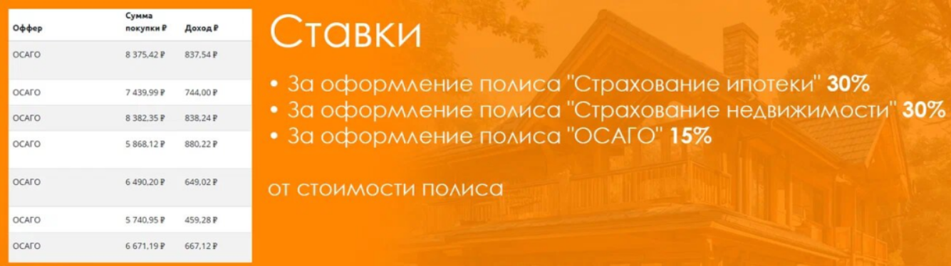• За оформление полиса «Страхование ипотеки» готовы выплачивать 30% от стоимости полиса для юр.лиц и самозанятых ИЛИ 21% от стоимости полиса для физ.лиц.