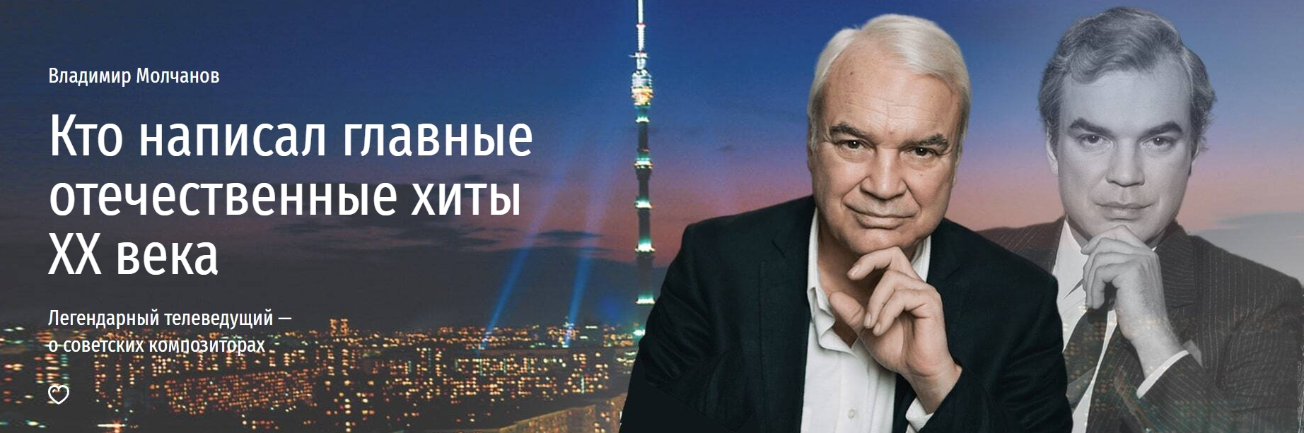 Со многими композиторами той эпохи легендарный телеведущий Владимир Молчанов был знаком лично. Героями его лекции станут Марк Фрадкин, Арно Бабаджанян, Борис Мокроусов, Ян Френкель, Аркадий Островский и Кирилл Молчанов (отец Владимира Молчанова).