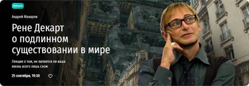 «Люди думают, что они существуют наяву, на самом деле многие из них лишь спят сном № 1 по ночам и просыпаются в сон № 2 днем. Присоединяйтесь к нам на лекции в „Прямой речи“, расскажу о Декарте и его методе исследования реальности. Попробуем определить: не является ли сном то, что вы считаете вашей жизнью», — говорит Андрей Макаров.