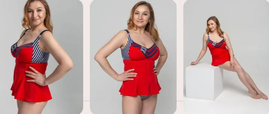 Танкини на бескаркасной базе и юбка из восьми клиньев, по желанию можно сделать шесть или четыре. Подчеркивает фигуру и скрывает недостатки. Также внутри встроена застежка для дополнительной поддержки.