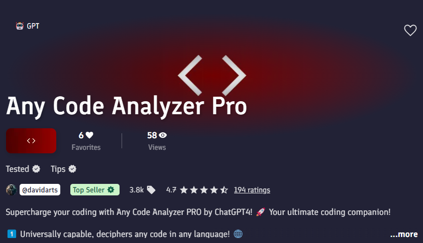 Supercharge your coding with Any Code Analyzer PRO by ChatGPT4! 🚀 Your ultimate coding companion! 1️⃣ Universally capable, deciphers any code in any language! 🌐 2️⃣ Swift and comprehensive - analyzes and reports within seconds! ⏱️ 3️⃣ Precisely interprets inputs and outputs. 💡 4️⃣ Explains...promptbase.com