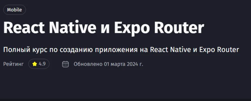 В этом курсе мы изучим React Native и Expo Router написав полноценное мобильное приложение с авторизацией и нативными возможностями. Этот курс подойдёт тем, кто хочет погрузиться в мобильную разработку имея опыт frontend разработки на React. От вас требуется знание JavaScript и React, а так же будет бонусом знание CSS и TypeScript, так как весь проект мы будем писать на нём.